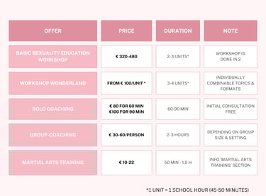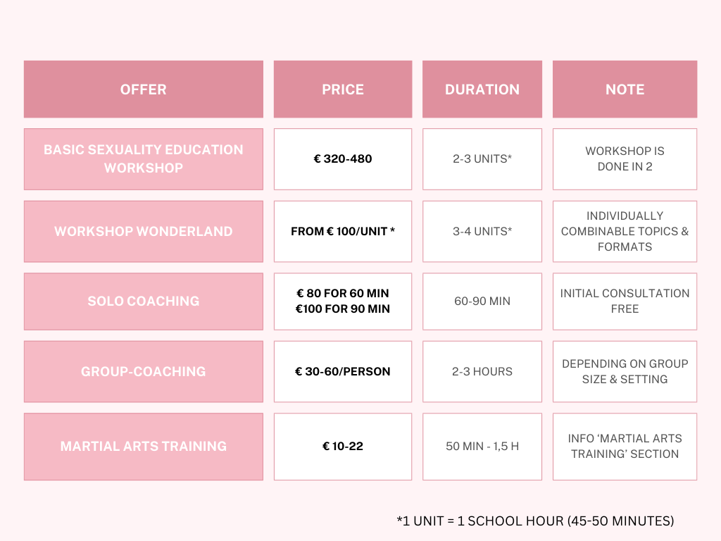 It’s important to me that my offerings remain accessible — regardless of budget or starting point. The following prices serve as a guideline and can be adjusted depending on the setting, group size, and needs. Feel free to contact me for more detailed information.