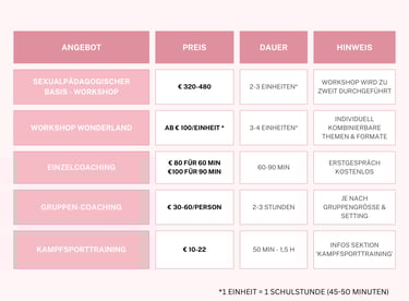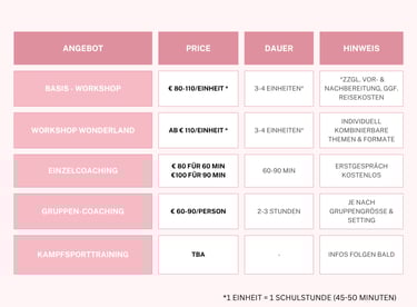 Mir ist wichtig, dass meine Angebote zugänglich bleiben – unabhängig von Budget oder Ausgangslage. Die folgenden Preise dienen als Orientierung und können je nach Rahmen, Gruppengröße und Bedarf angepasst werden. Für genauere Details kontaktiere mich gerne.